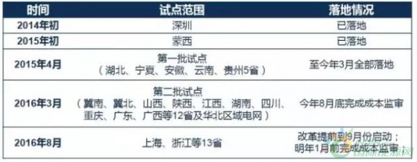 原定2017年開展的14個省級電網(wǎng)輸配電價改革提前至2016年9月啟動,基本實(shí)現(xiàn)省級電網(wǎng)的全覆蓋;計(jì)劃于2017年1月底完成成本監(jiān)審工作。
