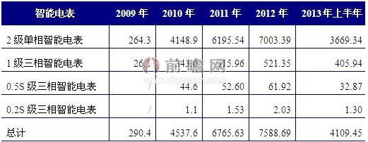 中國是電能表生產大國,目前感應式電能表、電子式電能表和智能化電能表等主要產品都已經達到或接近發(fā)達國家技術標準,生產和研發(fā)能力也已經能夠滿足國際市場的不同需求,而且價格優(yōu)勢明顯,在國際市場上具有較強的競爭力。據儀器儀表行業(yè)協(xié)會統(tǒng)計,2012年國內總產量達到1.1億只,其中智能電表占據過半份額。