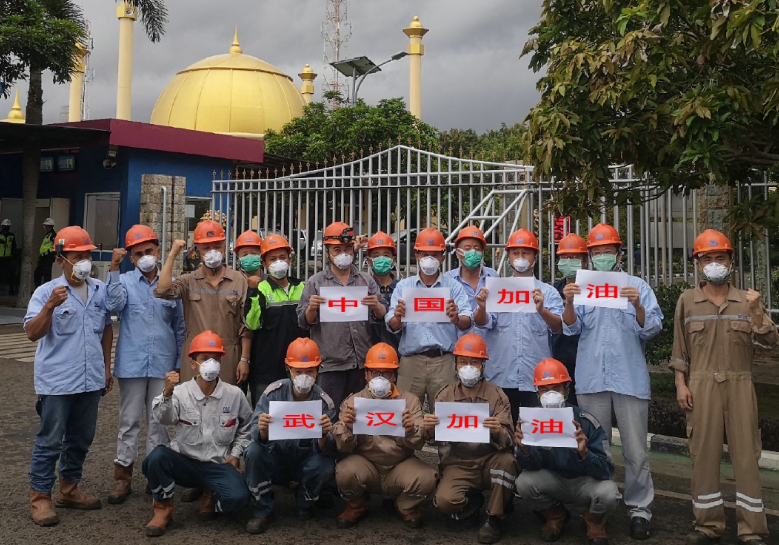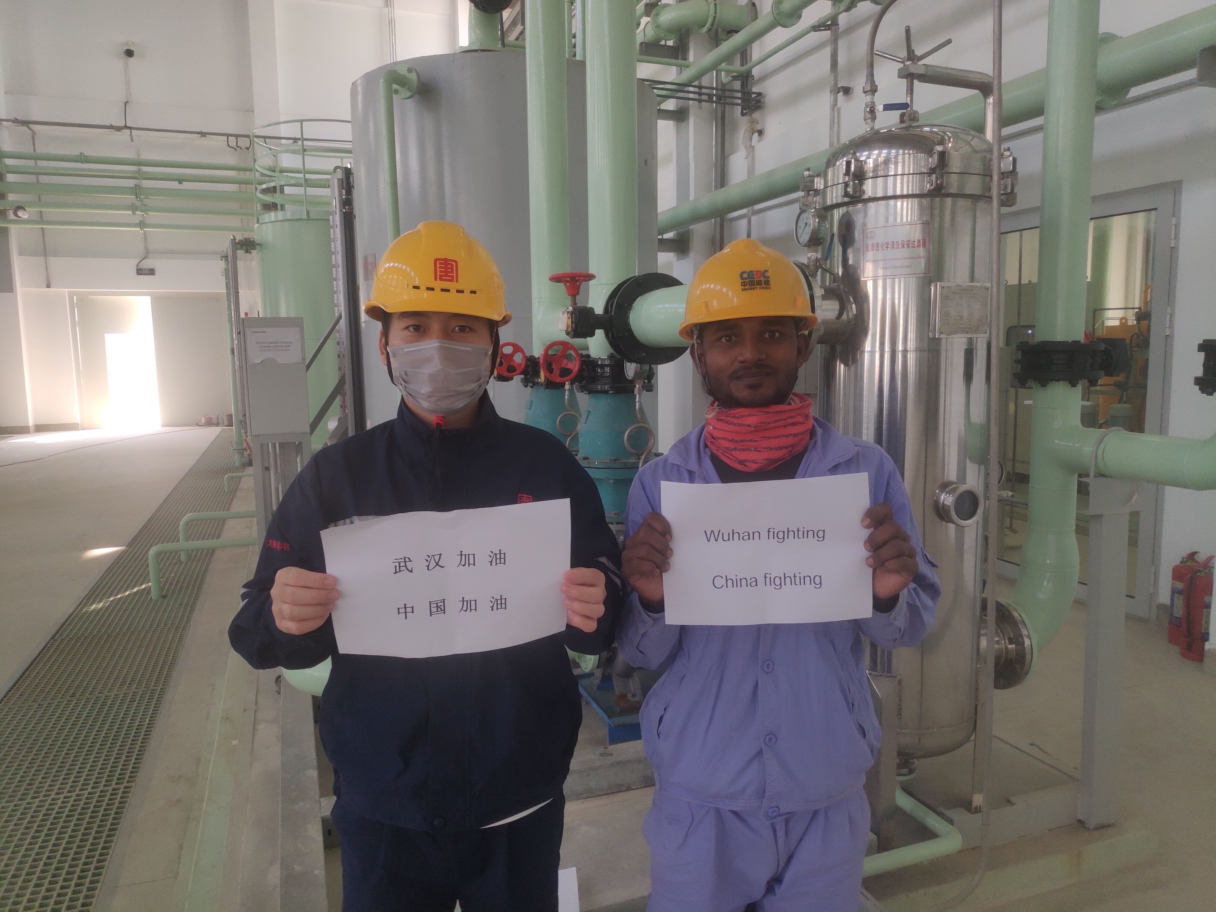 在大唐安徽發(fā)電公司承擔(dān)運(yùn)維工作的印尼芝拉扎電站,中印雙方人員共同為中國加油、為武漢加油。(朱成文/攝)
