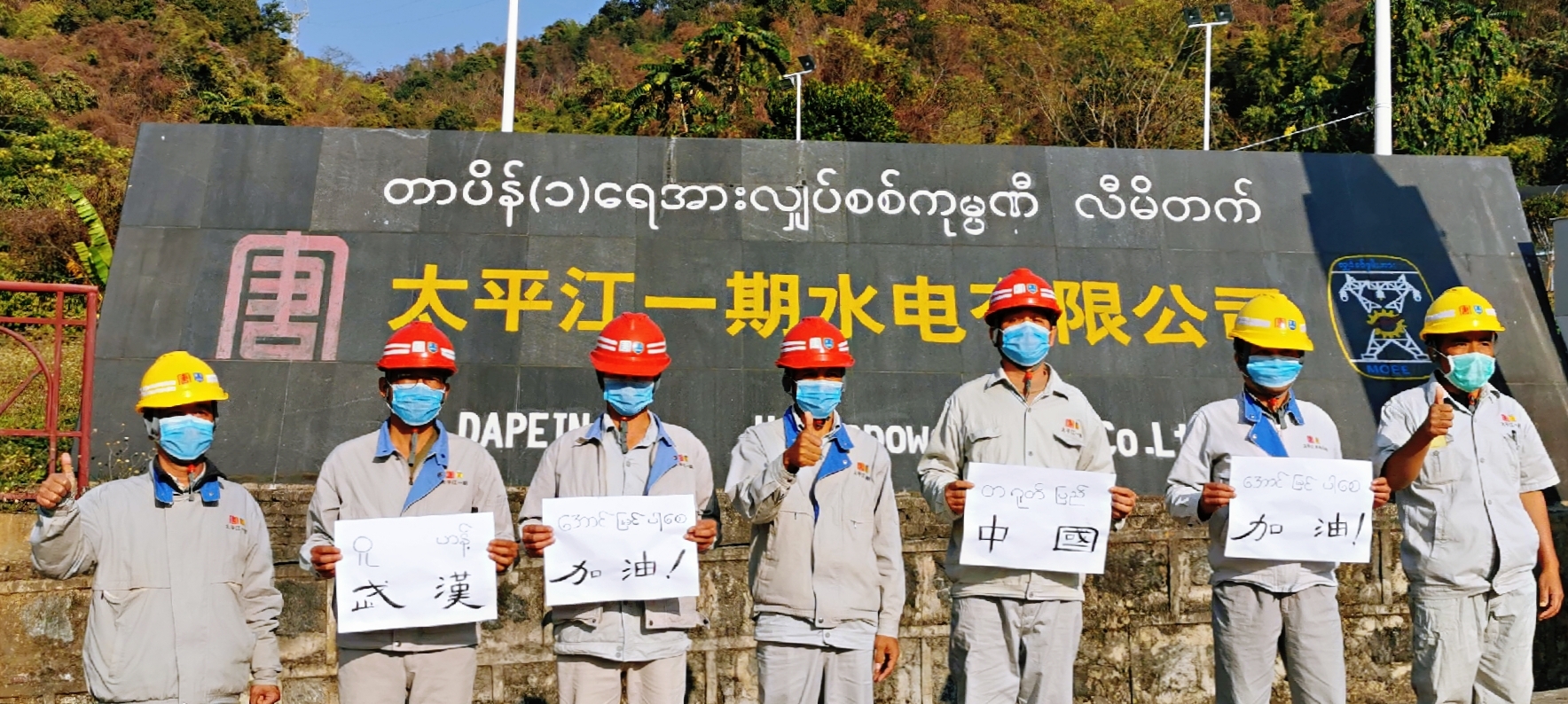 緬甸電力部派駐太平江電站的全體代表與大唐職工一起努力防疫抗疫,他們?yōu)槲錆h加油!為中國加油!(李永斌/攝)