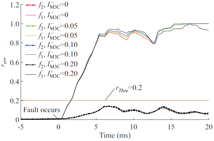 本文對(duì)圖1所示的帶有3個(gè)風(fēng)電場(chǎng)的低頻輸電系統(tǒng)進(jìn)行了仿真。計(jì)算結(jié)果表明:1)如圖3所示,區(qū)外故障時(shí),由本端模量信息計(jì)算的電壓反行波在故障暫態(tài)階段基本與由對(duì)端模量計(jì)算的電壓反行波重合,區(qū)內(nèi)故障下二者差異明顯;2)不同M3C負(fù)序電流指令下的電壓反行波差異仿真結(jié)果如圖4所示,結(jié)果表明,基于電壓反行波差異的縱聯(lián)保護(hù)在區(qū)內(nèi)故障時(shí)在能在5 ms內(nèi)可靠動(dòng)作,而在區(qū)外故障時(shí)不動(dòng)作。所提保護(hù)不受換流器故障控制策略影響,且具有較高的靈敏度。