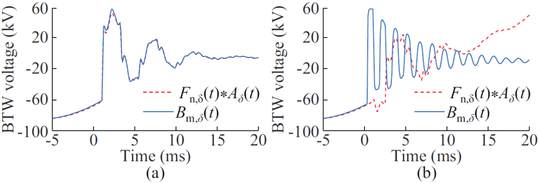 圖3 經(jīng)本端與對(duì)端模量信息計(jì)算的電壓反行波對(duì)比 (a) 區(qū)外故障 (b) 區(qū)內(nèi)故障
