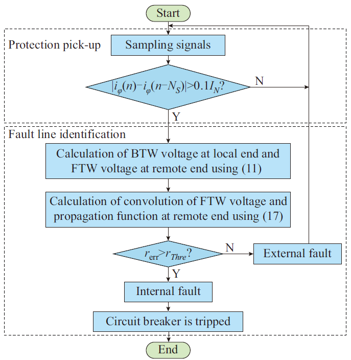 典型的換流器故障控制策略雖能弱化故障特征,但在故障暫態(tài)階段,故障特征主要受到海纜中電容和電感間能量交換的影響。同時(shí),換流器控制系統(tǒng)完成指定目標(biāo)需要一定時(shí)間,因此故障支路電流在故障暫態(tài)階段幅值較大并逐漸減小。充分利用該階段的故障信息,即可實(shí)現(xiàn)故障識(shí)別。鎧裝三芯海纜包含導(dǎo)芯、金屬屏蔽層和鎧裝,多導(dǎo)體之間存在電磁耦合,單獨(dú)分析相電氣量困難。對(duì)此,首先利用時(shí)域暫態(tài)信號(hào)相模變換,篩選出能夠反映各種故障類(lèi)型的模量。Marti模型考慮了線(xiàn)路頻變特性,能夠根據(jù)對(duì)端電壓前行波準(zhǔn)確計(jì)算本端電壓反行波。為了在低采樣率下實(shí)現(xiàn)計(jì)算,推導(dǎo)了基于插值的高精度電壓反行波電壓表達(dá)式?;陔妷悍葱胁ú町惖暮I巷L(fēng)電低頻輸電系統(tǒng)海纜縱聯(lián)保護(hù)方案流程圖如圖2所示。保護(hù)啟動(dòng)后,首先根據(jù)本端模量信息計(jì)算本端電壓反行波,然后通過(guò)對(duì)端電壓前行波與傳播函數(shù)間的卷積來(lái)計(jì)算本端電壓反行波,最終比較二者差異以實(shí)現(xiàn)海纜保護(hù)。
