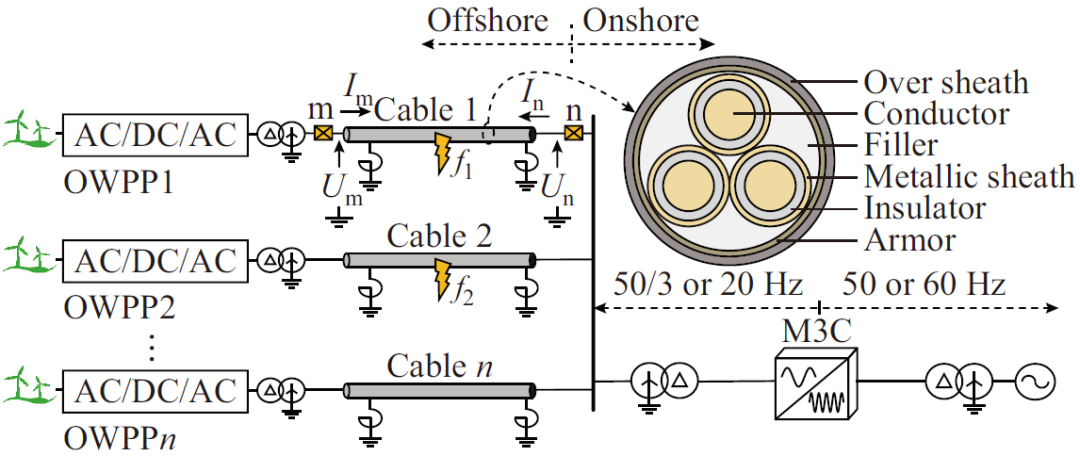 圖1給出了海上風(fēng)電低頻輸電系統(tǒng)拓?fù)?,海纜需匯集來(lái)自于風(fēng)電場(chǎng)的電能,并經(jīng)模塊化多電平矩陣換流器(modular multilevel matrix converter,M3C)實(shí)現(xiàn)頻率轉(zhuǎn)換,從而在M3C低頻側(cè)構(gòu)成了100%電力電子源場(chǎng)景。相較于同步機(jī)系統(tǒng)在負(fù)序網(wǎng)絡(luò)中源側(cè)只體現(xiàn)阻抗特性,低頻輸電系統(tǒng)負(fù)序網(wǎng)絡(luò)中線(xiàn)路兩側(cè)均可體現(xiàn)為電源特性。根據(jù)單相接地故障和兩相相間故障復(fù)合序網(wǎng)圖,故障支路電流可由負(fù)序電流唯一確定,當(dāng)M3C和海上風(fēng)電場(chǎng)網(wǎng)側(cè)變流器(grid-side converter, GSC)抑制負(fù)序電流時(shí),盡管故障點(diǎn)處存在負(fù)序電壓源,但兩側(cè)換流器均會(huì)生成幅值相位相同的電壓源,以抵消系統(tǒng)中的負(fù)序電流,因此系統(tǒng)故障電流仍保持對(duì)稱(chēng),使得故障支路的穩(wěn)態(tài)電流為0。上述分析表明,雖然風(fēng)電場(chǎng)升壓變壓器和M3C低頻側(cè)隔離變壓器網(wǎng)側(cè)中性點(diǎn)均采取直接接地方式,但低頻輸電系統(tǒng)在特定故障控制策略下呈現(xiàn)出類(lèi)似于中性點(diǎn)非直接接地系統(tǒng)的故障特征。