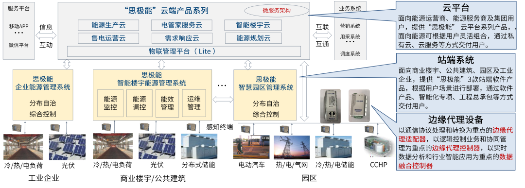 國網(wǎng)信通產(chǎn)業(yè)集團(tuán)依托“云-網(wǎng)-邊-端-芯-智-鏈”的信息通信全產(chǎn)業(yè)鏈體系,開發(fā)以“思極能”品牌為核心的智慧能源服務(wù)軟硬件產(chǎn)品,滿足能源運(yùn)營商/服務(wù)商、能源消費(fèi)者、能源產(chǎn)品商、政府等多元化用戶的綜合能源需求,打造智慧樓宇、智慧園區(qū)等典型CPS(信息物理系統(tǒng))場(chǎng)景的“智腦+神經(jīng)系統(tǒng)”,實(shí)現(xiàn)客戶側(cè)能源系統(tǒng)的安全、高效、低碳運(yùn)行。