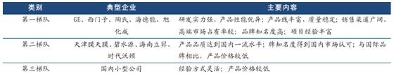 國內(nèi)膜法水處理行業(yè)公司可劃分為國際領先企業(yè),國內(nèi)領先企業(yè)和國內(nèi)小型企業(yè)三個梯隊
