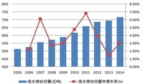 據(jù)統(tǒng)計(jì),目前全國(guó)地表水體中Ⅰ類(lèi)、Ⅱ類(lèi)、Ⅲ類(lèi)、Ⅳ類(lèi)、Ⅴ類(lèi)和劣Ⅴ類(lèi)水質(zhì)占比分別為31%、30%、21%、6%、9%和3%,其中Ⅳ類(lèi)及Ⅳ類(lèi)以下水質(zhì)水體占比近4成,水質(zhì)污染問(wèn)題嚴(yán)重。每年水質(zhì)污染給人體健康、工業(yè)生產(chǎn)、農(nóng)業(yè)生產(chǎn)和漁業(yè)養(yǎng)殖等方面造成的經(jīng)濟(jì)損失約2400億。。2014年全國(guó)廢水排放總量約為716億噸,較2005年的514億噸增長(zhǎng)近4成,2005至2014十年間年復(fù)合增長(zhǎng)率為3.4%,保持逐年穩(wěn)步增長(zhǎng)。
