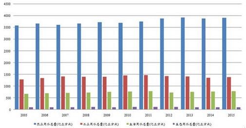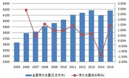 過(guò)去10年間,隨著人口增長(zhǎng),城市建設(shè)以及經(jīng)濟(jì)增長(zhǎng),全國(guó)用水總量總體呈現(xiàn)持續(xù)增長(zhǎng)態(tài)勢(shì),在2015年達(dá)到6180億立方米。(其中,由于首次進(jìn)行最嚴(yán)格水資源管理制度考核、以及農(nóng)業(yè)水價(jià)綜合改革和工業(yè)用水差別水價(jià)政策的推進(jìn),2014年的農(nóng)業(yè)和工業(yè)用水量分別出現(xiàn)下降,全國(guó)用水總量同時(shí)環(huán)比下降1.4%。)05至15年的用水總量年均復(fù)合增長(zhǎng)率約為0.93%,據(jù)此計(jì)算到2030年全國(guó)用水總量將達(dá)到7100億立方米。這一預(yù)測(cè)與《全國(guó)水資源綜合規(guī)劃》劃定的2030年用水上限不超過(guò)7000億立方米基本一致。因此,在可預(yù)見(jiàn)的未來(lái),用水量仍將繼續(xù)增長(zhǎng)。
