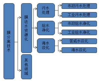 膜法水處理技術(shù)目前主要應(yīng)用于污水處理(包括市政污水處理和工業(yè)污水處理)、給水凈化(包括市政給水凈化和工業(yè)給水凈化)、海水淡化(苦咸水淡化)和純水制備等領(lǐng)域。