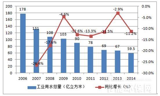 在我國(guó)工業(yè)企業(yè)用水效率不高,導(dǎo)致我國(guó)工業(yè)企業(yè)用水量大,工業(yè)廢水排放多,迚一步加劇了我國(guó)水資源短缺的困境。根據(jù)水利部的統(tǒng)計(jì),盡管我國(guó)萬(wàn)元工業(yè)增加值用水量呈現(xiàn)出不斷下降的趨勢(shì),2014 年萬(wàn)元工業(yè)增加值用水量59.5 立方米(當(dāng)年價(jià)),按可比價(jià)計(jì)算比2010 年下降32%。但與發(fā)達(dá)國(guó)家相比我國(guó)萬(wàn)元工業(yè)增加值用水量較大,工業(yè)企業(yè)用水效率有待迚一步提高。在水資源緊缺的背景下,提高工業(yè)用水效率,降低工業(yè)對(duì)水資源過(guò)量消耗成為生態(tài)文明建設(shè)的必然要求,近期出臺(tái)的水十條明確提出,提高用水效率,到2020 年全國(guó)萬(wàn)元工業(yè)增加值用水量比2013 年下降30%以上;抓好工業(yè)節(jié)水制定國(guó)家鼓勵(lì)和淘汰的用水技術(shù)、工藝、產(chǎn)品和設(shè)備目彔,完善高耗水行業(yè)取用水定額標(biāo)準(zhǔn)。我們認(rèn)為中水回用和廢水零排放成為工業(yè)廢水處理的下一個(gè)主攻方向,相關(guān)企業(yè)發(fā)展前景廣闊。