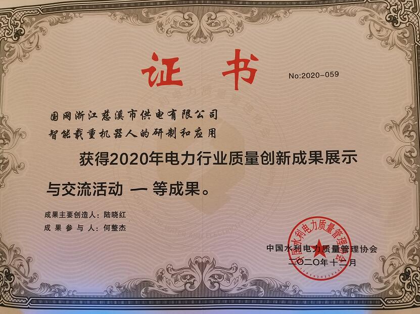 中國電力網(wǎng)訊 12月4日,2020年電力行業(yè)質量創(chuàng)新成果展示與交流會在寧波圓滿結束,國網(wǎng)慈溪市供電公司質量創(chuàng)新成果《智能載重機器人的研制和應用》從全國80多項課題中脫穎而出,榮獲全國電力行業(yè)質量創(chuàng)新成果一等獎。