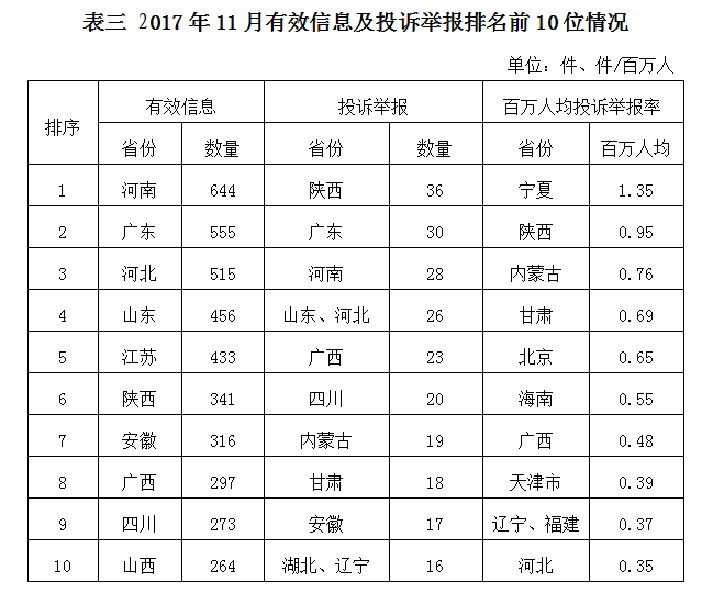 2017年11月,各?。ㄗ灾螀^(qū)、直轄市)按照有效信息數(shù)量排序,河南、廣東、河北等省列全國(guó)前10位;按照投訴舉報(bào)數(shù)量排序,陜西、廣東、河南等省排在全國(guó)前10位;按照百萬(wàn)人均投訴舉報(bào)率排序,寧夏,陜西,內(nèi)蒙古等省位于全國(guó)前10位。(2017年11月有效信息及投訴舉報(bào)排名前10位情況見表三)