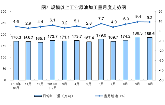 10月份,加工原油5784萬(wàn)噸,同比增長(zhǎng)9.2%,增速比上月放緩0.2個(gè)百分點(diǎn);日均加工186.6萬(wàn)噸,環(huán)比減少1.7萬(wàn)噸。1—10月份,加工原油53710萬(wàn)噸,同比增長(zhǎng)6.4%。