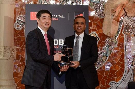華為輪值CEO胡厚崑(左)接受GSMA主席、印度Bharti公司創(chuàng)始人兼董事長Sunil Bharti Mittal(右)頒獎
