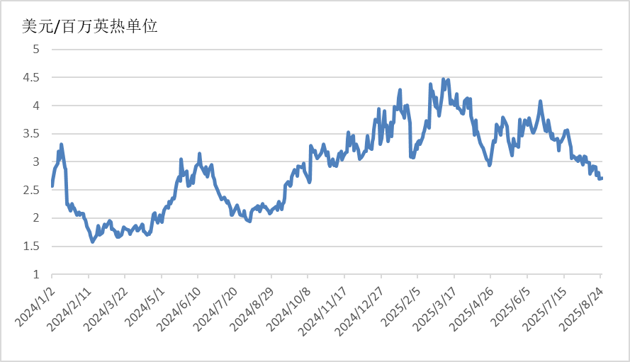 截至8月25日,美國(guó)Henry Hub天然氣主力合約收于2.709美元/百萬英熱單位,月環(huán)比下降12.47%,相較于2024年同期的2.12美元/百萬英熱單位,上漲27.78%。