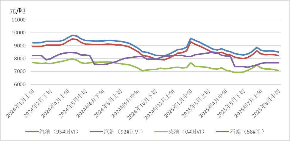 8月中旬,IEA上調(diào)全球石油供應(yīng)過剩預(yù)期,美國(guó)能源信息署(EIA)預(yù)測(cè)2025年美國(guó)原油日產(chǎn)量將創(chuàng)1341萬桶紀(jì)錄,夏季駕駛旺季臨近尾聲原油需求下降預(yù)期增強(qiáng),中美關(guān)稅暫停措施再延長(zhǎng)90天等因素推動(dòng)國(guó)際油價(jià)延續(xù)下跌態(tài)勢(shì)。然而,市場(chǎng)對(duì)美聯(lián)儲(chǔ)9月降息的預(yù)期增強(qiáng),阿拉斯加美俄峰會(huì)并未取得實(shí)質(zhì)性進(jìn)展,俄烏局勢(shì)不確定性推升地緣風(fēng)險(xiǎn)溢價(jià),受上述因素影響,國(guó)際油價(jià)跌幅有所收窄。